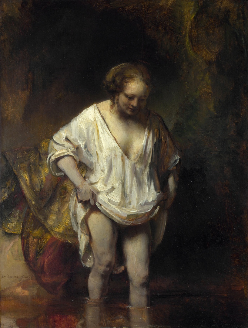 Рембрандт «Женщина, купающаяся в реке», 1654 Национальная галерея, Лондон Барокко «Женщина, купающаяся в реке» — одна из жемчужин коллекции Лондонской Национальной галереи. Картина относится к позднему периоду творчества Рембрандта и своей простотой значительно отличается от других изящных и романтичных работ. Художник изобразил бытовой сюжет, фрагмент из жизни молодой женщины, заходящей в воду, который наполнен поэтичностью… Подробнее »