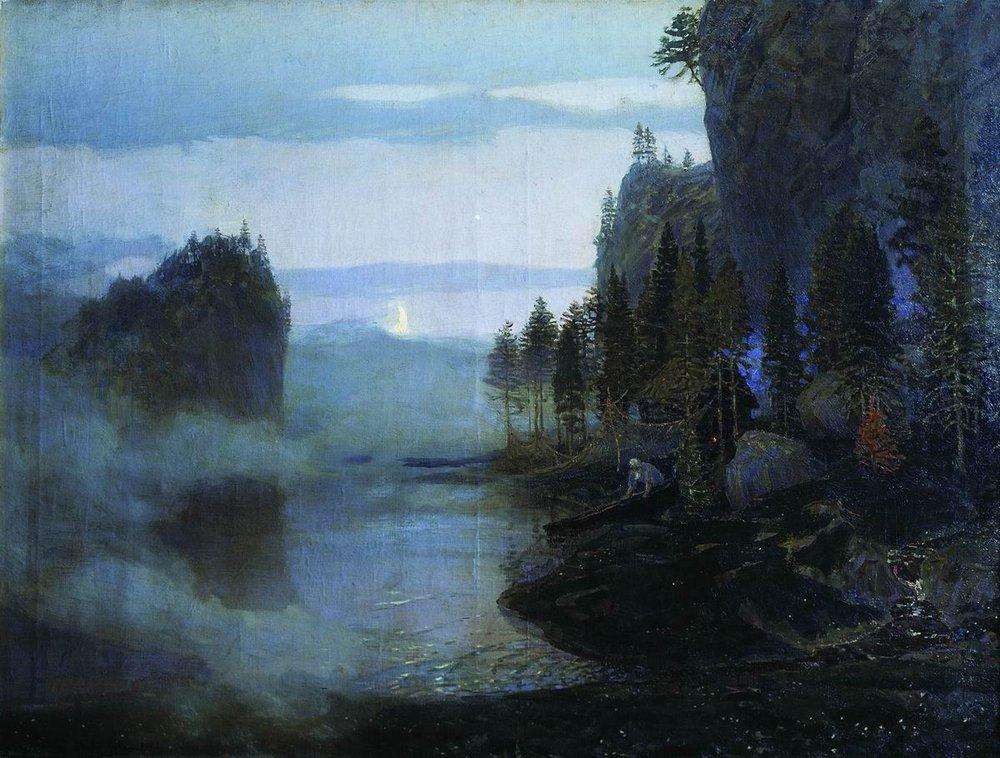 Васнецов Аполлинарий Михайлович «Баллада. Урал. «, 1897 Реализм В том краю, где суровыми скалами берега над рекою стоят, Где вдали, за вершин перевалами, багровея, уходит закат, Где бескрайняя и нелюдимая расстелилась под небом тайга, Где болотами непроходимыми не ступала живая нога, В глади рек свет луны отражается, из-за туч одиноко глядит, И звезда, восходя, улыбается,… Подробнее »