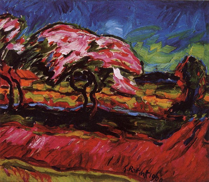 Карл Шмидт-Ротлуф «Цветущие деревья», 1909 Экспрессионизм Полная внутренней силы и динамики манера живописи излучает жизненную энергию: колорит составлен из глубоких насыщенных тонов, а предметы — например, дерево в центре композиции — написаны редкими неистовыми ударами кисти. Подобно тому, как это делал Винсент Ван Гог двадцатью годами раньше, художник использует здесь Густые мазки сочных контрастных цветов… Подробнее »