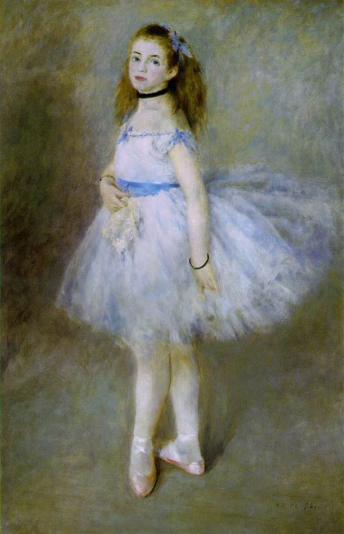 Пьер Огюст Ренуар «Танцовщица», 1874 Национальная галерея искусства, Вашингтон Импрессионизм Картина монофигурна, и «аскетична» по композиции. Характерен минимализм деталей и предметного насыщения полотна. На картине изображена совсем юная балерина в бледно-лиловой пачке и нежно-розовых пуантах. Очень нежная пастельная гамма, избранная художником, подчёркивает изящность самой танцовщицы. Густая насыщенная тень обрамляет и выгодно оттеняет светло-васильковое платье. Чёрные… Подробнее »