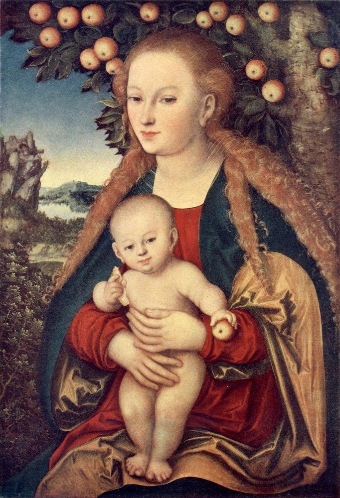 Лукас Кранах Старший «Мадонна с Младенцем под яблоней», 1520-1530 Эрмитаж, Санкт-Петербург Возрождение Кранах изобразил рыжеволосую Мадонну в образе прекрасной молодой женщины, напоминающей принцессу из немецких сказок. Она находится в яблоневом саду на фоне пейзажа с видом Саксонии замком и горами. Одежда Мадонны соответствует одежде немецких аристократок. Цветовая гамма картины разнообразна и насыщена благородным красным, желтым,… Подробнее »
