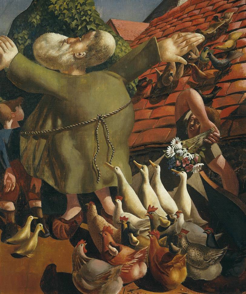 Стенли Спенсер «Святой Франциск», 1935 Неоромантизм В картине господствует наивная и несоразмерная другим деталям фигура Святого Франциска, повернувшегося к нам спиной и протягивающего руки к небу. Его фигура имеет устойчивую, почти цилиндрическую форму, а руки странным образом поменялись местами. Утки, куры и другие птицы на крыше пристально смотрят на святого, словно поклоняясь ему. Краска положена… Подробнее »