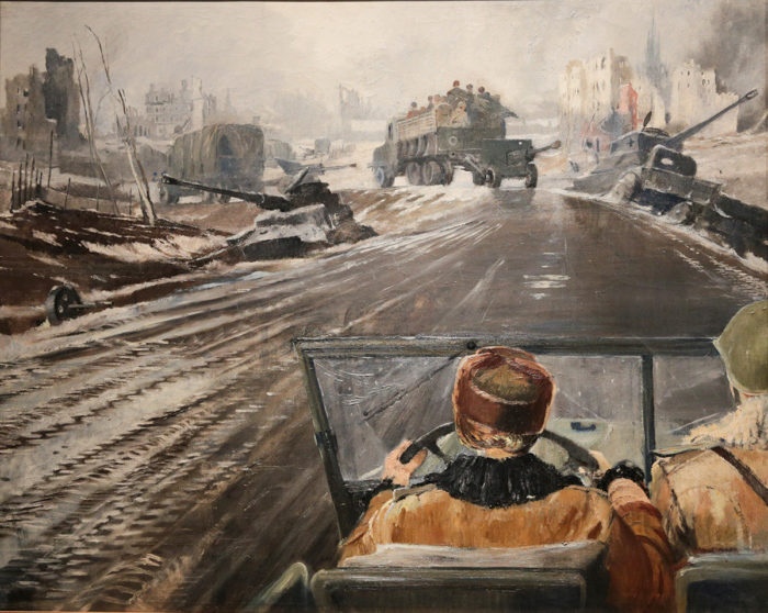 Юрий Пименов «Фронтовая дорога», 1944 Русский музей, Санкт-Петербург Главное произведение Юрия Пименова эпохи соцреализма — картина «Новая Москва», написанная за 4 года до начала Великой Отечественной войны. Ее сюжет прост: девушка в легком летнем платье за рулем машины проезжает по цветущей Москве, которая к 1937 году украшается новыми постройками в стиле сталинского ампира. Картина передает… Подробнее »