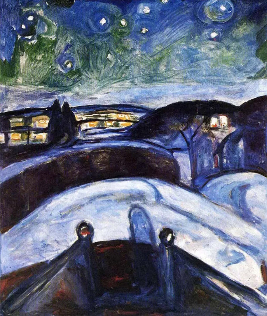 Эдвард Мунк «Звездная ночь», 1923-1924 Музей Мунка, Осло Экспрессионизм Звездное небо вдохновило мастера на несколько разных работ. В этой поздней своей работе Мунк представил зимний вариант неба. Работа написана с крыльца дома художника. Зима накрыла город пушной шапкой. Автор дает лишь общее представление о «земной» части пейзажа. Его интересует небо, усыпанное крупными звездами, полное зеленоватых… Подробнее »