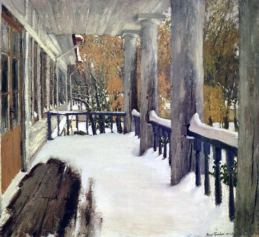 Игорь Эммануилович Грабарь «Сентябрьский снег», 1903 Третьяковская галерея, Москва Импрессионизм Иван Есаулков Снег в сентябре выпадает нередко, И так пушиста его белизна На ветвях елей, берёзовых ветках! Падает снег, а вокруг – тишина. У полотна серо-голубоватый, Объединяющий все цвета тон. Пол с потолком у террасы дощаты, Слева – ряд окон, а справа – колонн. Словно… Подробнее »