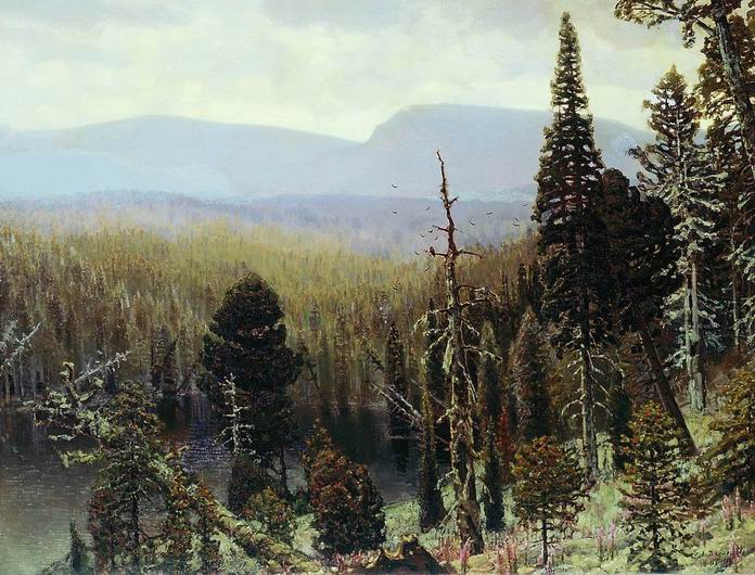 Аполлинарий Михайлович Васнецов «Тайга на Урале. Синяя гора», 1891 Государственная Третьяковская галерея, Москва Модерн Величавое повествование о жизни могучей природы Урала ведет в этой картине Васнецов. Большими, обобщенными массами уходят за озером вдаль леса, постепенно покрывающиеся синеватой дымкой. Струя дыма от далекого охотничьего костра поднимается, растворяясь над тайгой. Далеко-далеко над лесом испуганные чем-то беспокойно кружат… Подробнее »