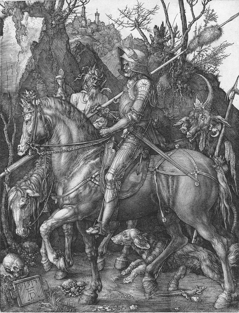 Альбрехт Дюрер «Рыцарь, смерть и дьявол», 1513 Северное Возрождение На гравюре облачённый в доспехи христианский рыцарь, в узком ущелье, в сопровождении Дьявола со свиным рылом и Смерти — верхом на коне. Смерть держит песочные часы, чтобы напомнить рыцарю о краткости его жизни и тщетности усилий. Дьявол следует по пятам, готовый воспользоваться каждой ошибкой. Но всадник… Подробнее »