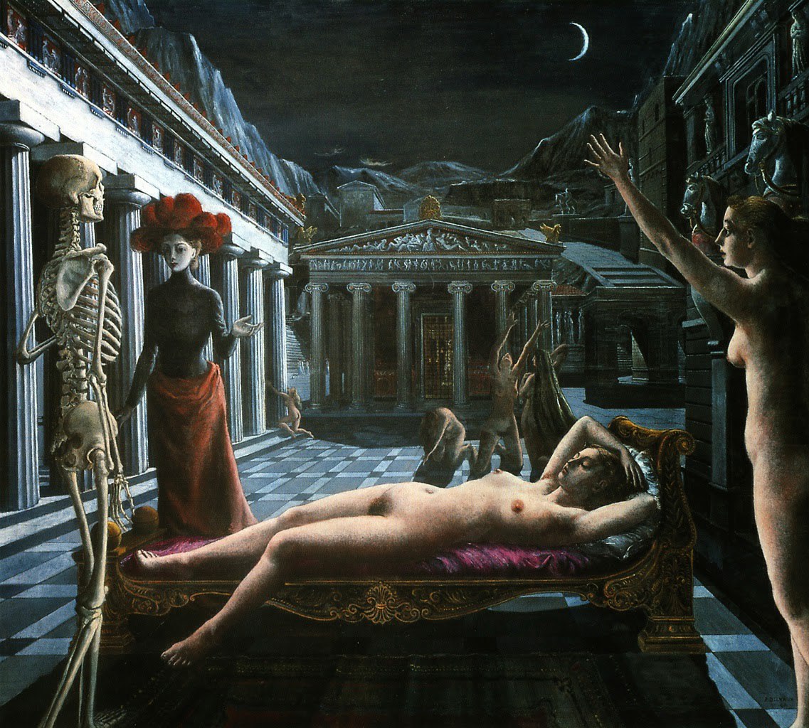 Поль Дельво «Спящая Венера», 1944 Галерея Тэйт, Лондон Сюрреализм Венера, спящая в окружении скелета и манекена, изображена в залитом лунным светом городе. Она спит с раскрытыми ногами, ей грезится, что она соблазняет Смерть. Это сочетание юной женской красоты и смерти, желания и ужаса придает картине столь беспокойный характер. Многие сюрреалисты, такие как Дельво, часто изображали… Подробнее »