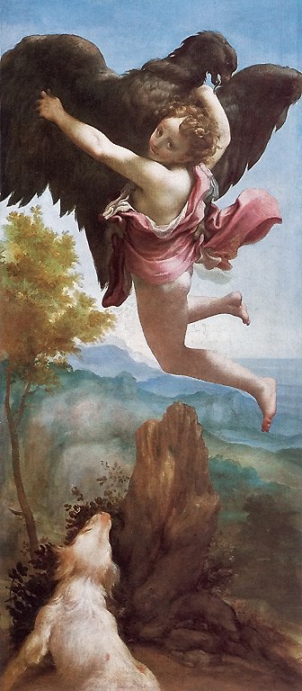 Корреджо «Похищение Ганимеда», 1531 Музей истории искусства, Вена Возрождение Согласно древнегреческой легенде, Зевс, повелитель богов и смертных, восхищенный красотой сына царя Троса, юного Ганимеда, повелел похитить его, находя, что земля — недостойное место для пребывания прекрасного юноши. В то время, когда Ганимед пас отцовские стада на склонах Иды, появился орел, посланный Зевсом, схватил когтями молодого… Подробнее »