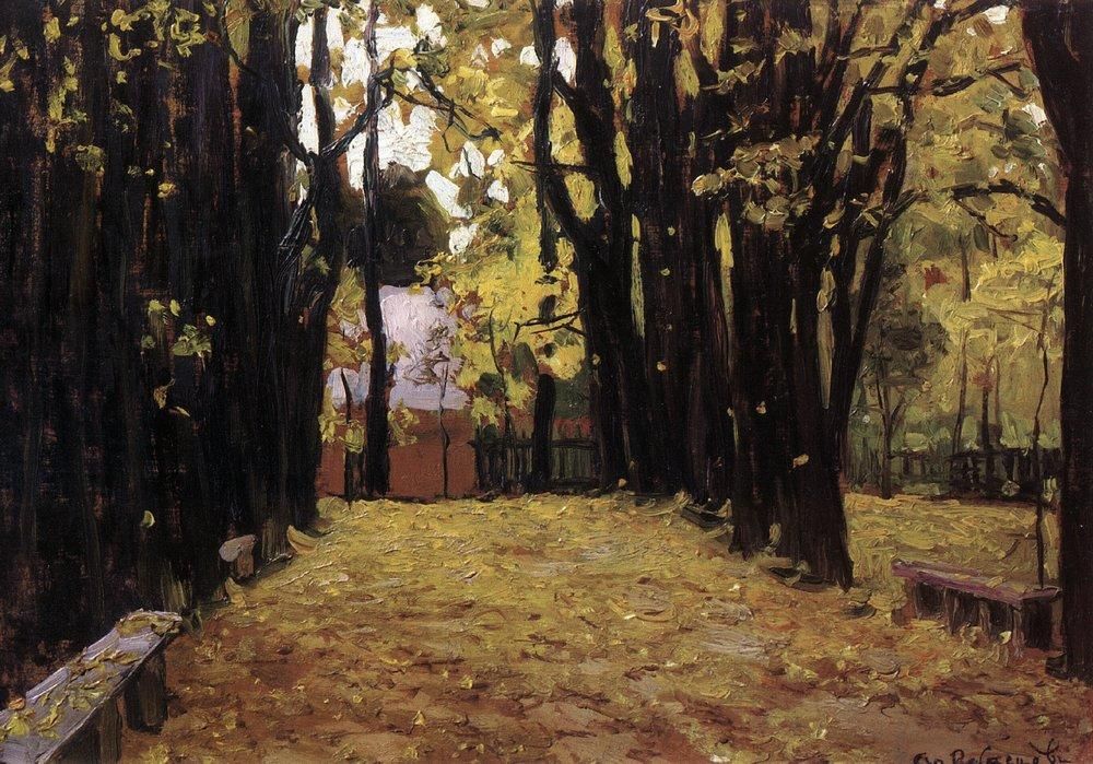 Аполлинарий Михайлович Васнецов «Осень», 1910-е Импрессионизм, пейзаж Осенний поцелуй В день тишины открытые глаза Увидят за окном на небе проседь, И по стеклу бегущая слеза Напомнит невзначай что значит осень. Что значит лист, лежащий на земле Недвижимо в обыденном теченьи, Как поцелуй, горящий на челе Немого дня, застывшего в смущеньи… Константин Быстров