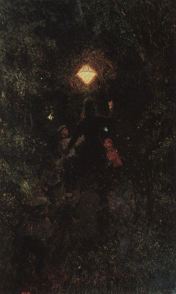 Илья Ефимович Репин «Прогулка с фонарями», 1879 Русский музей, Санкт-Петербург Импрессионизм Аллея парка, темный вечер. В центре фигура Е.Г.Мамонтовой со спины; одета в платье, на плечи спускаются локоны; в правой руке держит высоко над головой бумажный фонарь, левой рукой — руку девочки в белом платье с темным широким поясом. Перед Е.Г. — обернувшийся к ней… Подробнее »