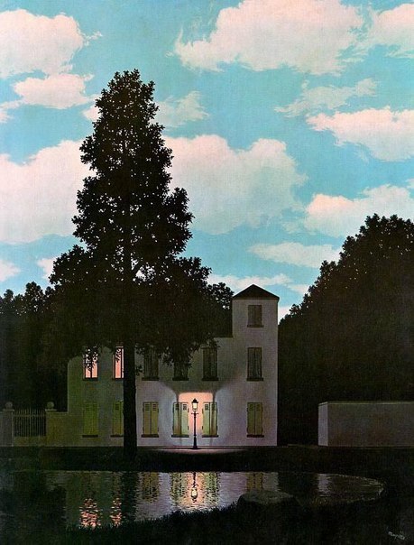 Рене Магритт «Империя света», 1954 Музей изящных искусств, Брюссель Сюрреализм Это полотно представляет собой странный ночной пейзаж под небесами, освещёнными дневным светом .На берегу небольшого озера, в тени раскидистых деревьев, прячется дом, в котором уютным розовым светом горят окошки. Одинокий фонарь дарит свой дружелюбный свет путнику, который может оказаться здесь глухой, тёмной ночью…Сам художник объяснял… Подробнее »