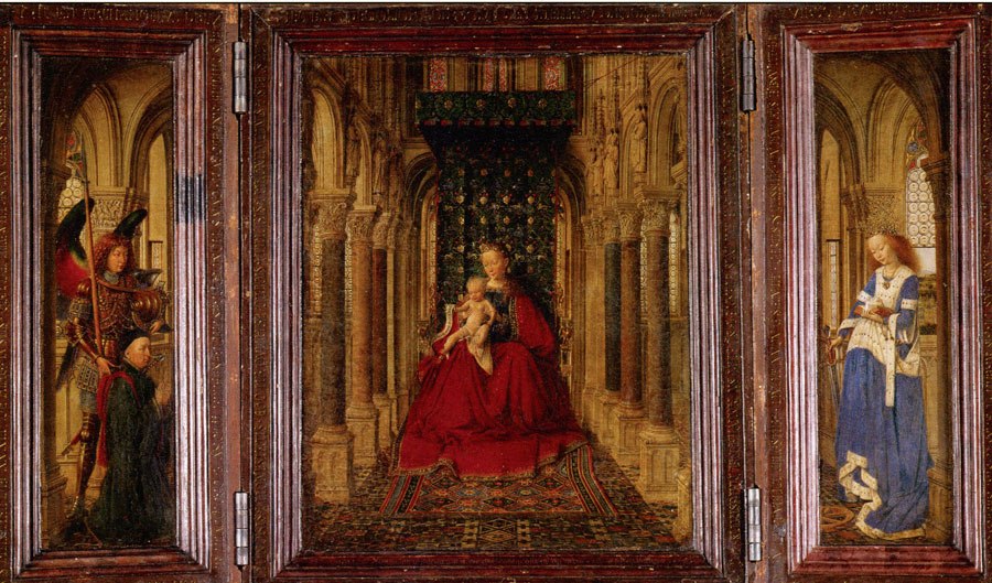 Ян ван Эйк «Богоматерь с Младенцем на троне в храме» (триптих), 1437 Дрезденская галерея Возрождение Это небольшое по размерам произведение — подлинный шедевр нидерландского искусства XV века. В центральной части триптиха — Дева Мария с Младенцем в роскошном интерьере готического собора, восседающая на великолепном резном троне между двумя рядами разноцветных колонн из яшмы и мрамора. Левая створка… Подробнее »