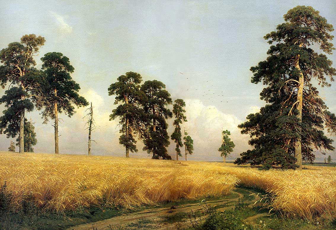 Шишкин Иван Иванович «Рожь», 1878 Третьяковская галерея, Москва Реализм Одна из самых знаменитых работ, в которой художник мастерски передал колосящуюся золотистую рожь, охраняемую богатырями соснами великанами уходящими в воздушной перспективе в даль, вдоль уходящей извилистой колеи дороги, сопровождаемой сочной яркой травой. Казалось бы золотистое поле, колосится рожь, в дымке проглядывается дальние очертания горизонта, композиция позволившая… Подробнее »