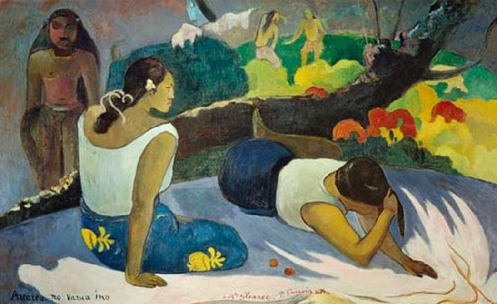 Поль Гоген «Забава злого духа», 1894 Новая Глиптотека Карлсберга Постимпрессионизм Оригинальное название картины «Arearea no varua ino» можно приблизительно перевести как «Забава злого духа». Arearea означает забава, озорная шутка, развлечение, а varua ino — злой дух, дьявол. На переднем плане изображены две женщины — сидящая и лежащая. За ними пейзаж разделён по диагонали на две… Подробнее »