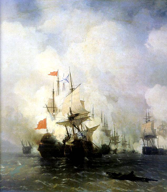 Иван Константинович Айвазовский «Бой в Хиосском проливе», 1848 Феодосийская картинная галерея им. И.К.Айвазовского Романтизм Событиям русско-турецкой войны (1768-1774) посвящены две парные картины «Бой в Хиосском проливе» и «Чесменский бой». 27 июня 1770 года русский флагманский корабль адмирала Г. А. Спиридова (1737-1790) «Евстафий» взял на абордаж и поджег флагманский турецкий корабль «Реал-Мустафа». Оставшись без руководства, турецкие… Подробнее »