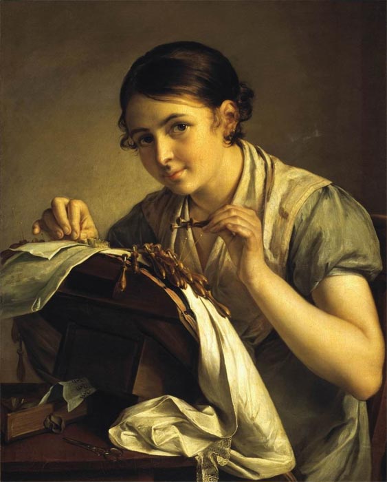 Василий Андреевич Тропинин «Кружевница», 1823 Третьяковская галерея, Москва Романтизм «Кружевница» — первый образ, появившийся в череде женских портретов, посвященных не парадному выходу. Этот портрет выполнен совершенно в другой стилистике. Тропинин как бы явился первооткрывателем этого жанра, показав женский образ без привычной помпезности, парадности и чопорности. Вслед за «Кружевницей» Тропинин пишет «Золотошвейку», «Пряху», «За прошивками» —… Подробнее »