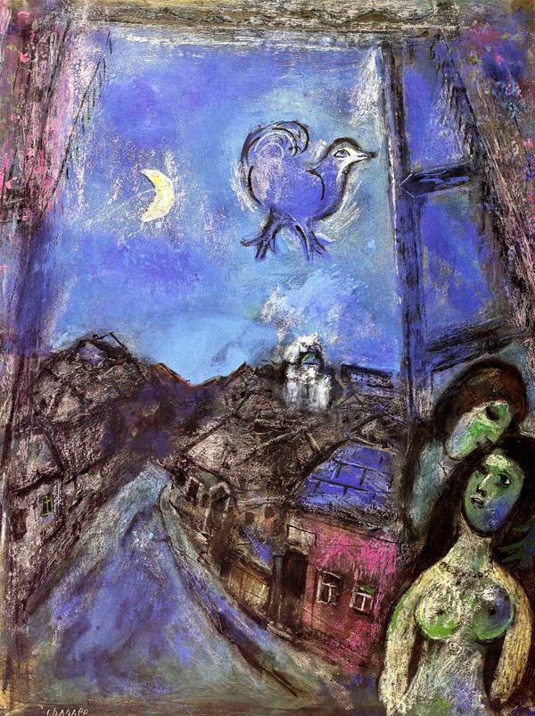 Марк Шагал «Вечер у окна», 1950 Частная коллекция Сюрреализм «Вечер у окна» — картина, на которой изображена пара влюбленных. Они стоят у окна в темной комнате на фоне открытого окна. Окно и видимая из него улица занимают передний фон, потеснив любовников вправо. В раскрытое окно далеко видна городская улица и ярко-синее небо. На небе виден… Подробнее »