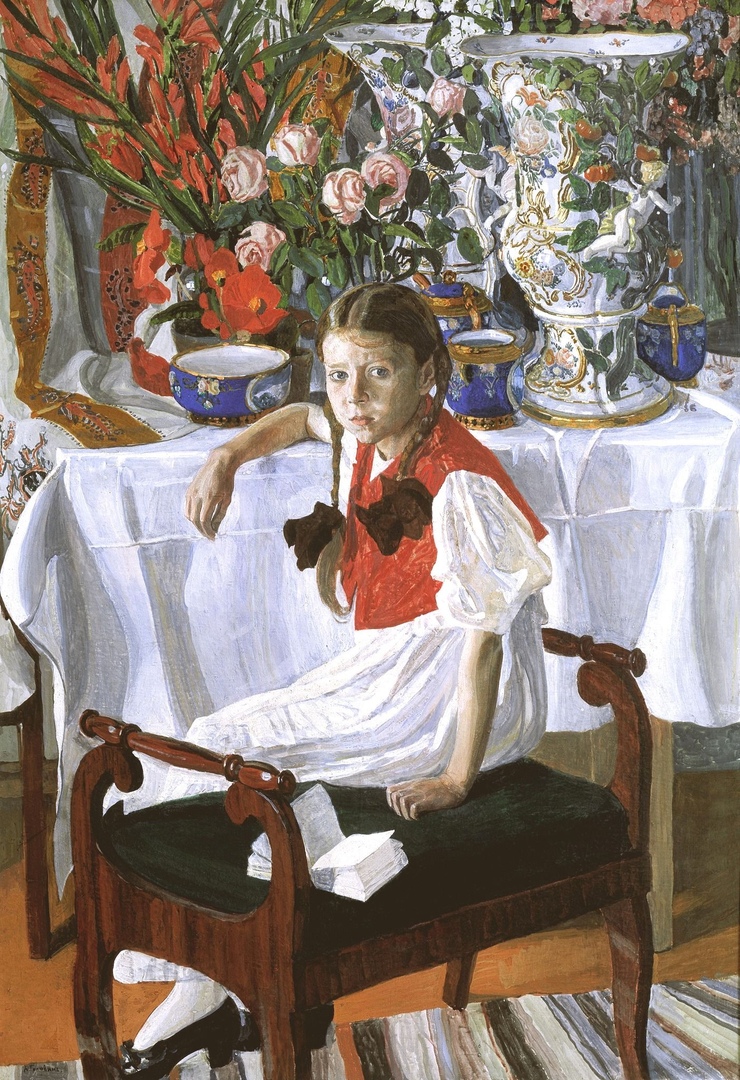 Александр Головин «Девочка и фарфор (Фрося)», 1916 Государственная Третьяковская галерея, Москва Модерн На переднем плане картины представлена девочка, робко присевшая на край дорогого стула в стиле ампир. Художник изобразил Фросю — пятилетнюю дочь дворника в доме, где он жил в то время. Она ощущает себя чужой среди роскошной обстановки интерьера. Стол заставлен антикварными вазами и… Подробнее »