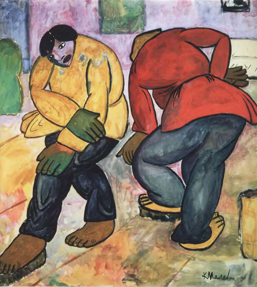 Казимир Малевич «Полотеры», 1912 Городской музей, Амстердам Кубизм Работа полотеров напоминает яростный танец. Сравните эту картину со знаменитым «Танцем» Матисса, чтобы убедиться в том, насколько очаровало Малевича тогда творчество фовистов. Лицо полотера изображено максимально условно — в традициях примитива (два стилизованных глаза, искаженная черточка носа). Малевич не стремится к анатомической похожести, ему важно лишь показать… Подробнее »