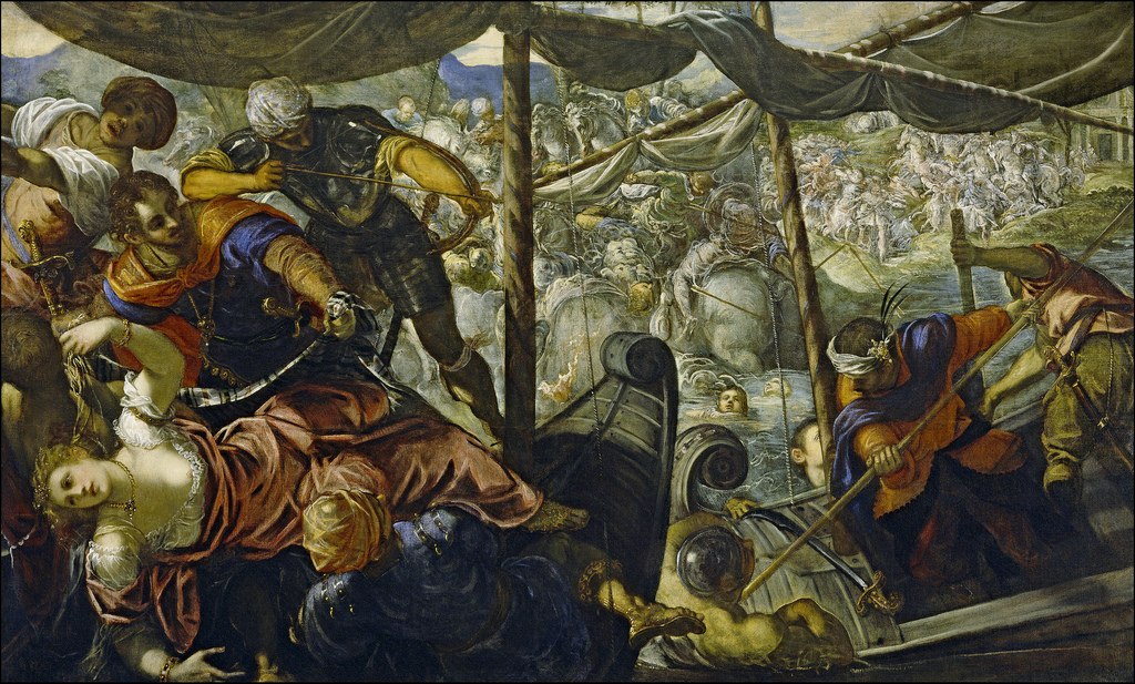 «Похищение Елены», ок. 1578 Музей Прадо, Мадрид На картине изображён миф о похищении Елены Прекрасной Парисом, действие которого перенесено в современную художнику Европу XVI века. Возможно, мотив именно морского сражения был навеян битвой при Лепанто, произошедшей 7 октября 1571 года в Патрасском заливе у мыса Скрофа. Тогда объединённые силы Священной лиги, куда входили Испания, Венецианская… Подробнее »
