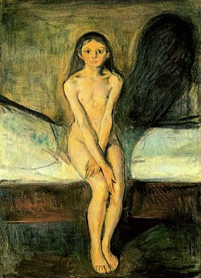 Эдвард «Созревание», 1894 Национальная галерея, Осло На картине изображена худенькая обнаженная девочка лет четырнадцати, сидящая, скрестив руки на коленях, на неприбранной постели. Комната залита светом, но фигура девочки отбрасывает на стену непропорционально большую и темную тень. Критики отмечали исходящее от этой тени ощущение угрозы, а также ее «фаллическую» форму. Это внутреннее напряжение усиливается позой девочки,… Подробнее »