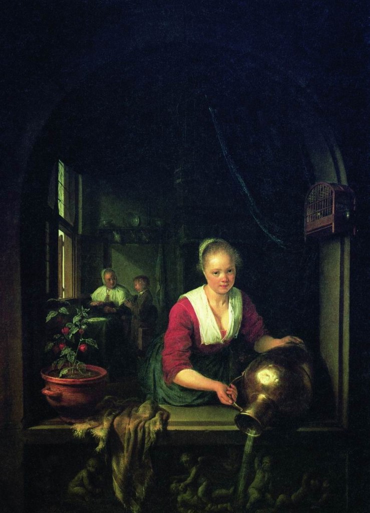 Герард «Служанка в окне», 1650-е Художественный музей, Антверпен, Бельгия Искусно скомпонованная камерная композиция представляет молодую служанку, выливающую воду из медного кувшина через парапет окна, которое заключает всю сцену в подобие рамы. Художник с пристальным вниманием выписал детали, такие как глиняный цветочный горшок, клетка для птицы или поношенная одежда, придав картине качество почти ювелирной вещи. Доу… Подробнее »