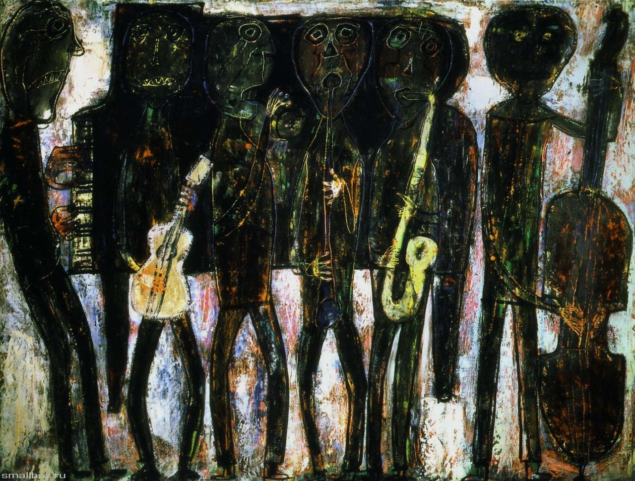 Жан «Джаз-банд (Блюз в непристойном стиле)», 1955 Фигуры этой джаз-группы выстроились со своими инструментами вдоль края картины. Нанеся краску на холст в случайных сочетаниях, художник частично размазал ее по поверхности, а затем процарапал контуры фигур и лиц музыкантов. Эффект граффити — уличного настенного изображения анонимного происхождения — смешит и очаровывает, придавая картине безыскусную детскую непосредственность…. Подробнее »