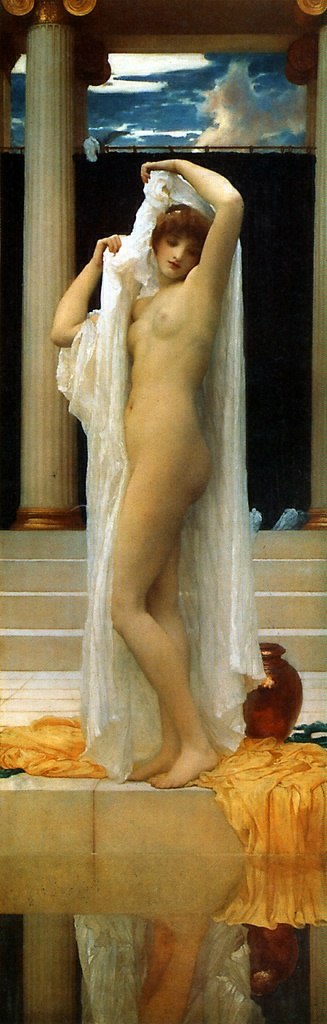 Фредерик «Купание Психеи», 1890 Чувственная, с нежной фарфоровой кожей богиня любуется своим отражением перед тем, как сойти в купальню. Теплые оттенки желтого, белого и телесного цвета создают ощущение покоя, а ионическая колонна на заднем плане и вытянутая форма холста подчеркивают стройность тела. Неразличимые глазу мазки столь же гладки и прозрачны, как поверхность воды. Получивший художественное… Подробнее »