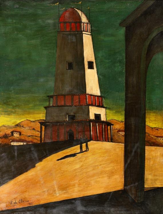 Джорджо де «Большая башня», 1921 Эта картина является повторением большей по формату композиции «Ностальгия по вечности», написанной художником в 1913 году. В ней, как и во многих других своих работах, де Кирико вводит зрителя в метафизический мир образов и символов. На картине изображена высокая башня, которая стоит на большом песчаном бархане, высвеченном вечерним солнцем. За… Подробнее »