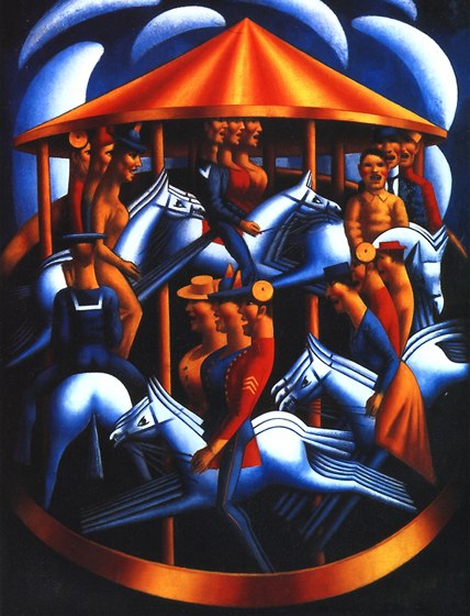 Марк «Карусель», 1916 Оцепеневшие человеческие фигуры с широко раскрытыми ртами напоминают пронзительно ярких механических кукол. Есть что-то зловещее в повторяющемся ритме композиции, мотиве бесконечного вращения карусели и общем характере образов. Военная форма некоторых персонажей позволяет видеть в этом произведении сатиру на войну — время создания картины как раз приходится на начало Первой мировой войны. Одна… Подробнее »