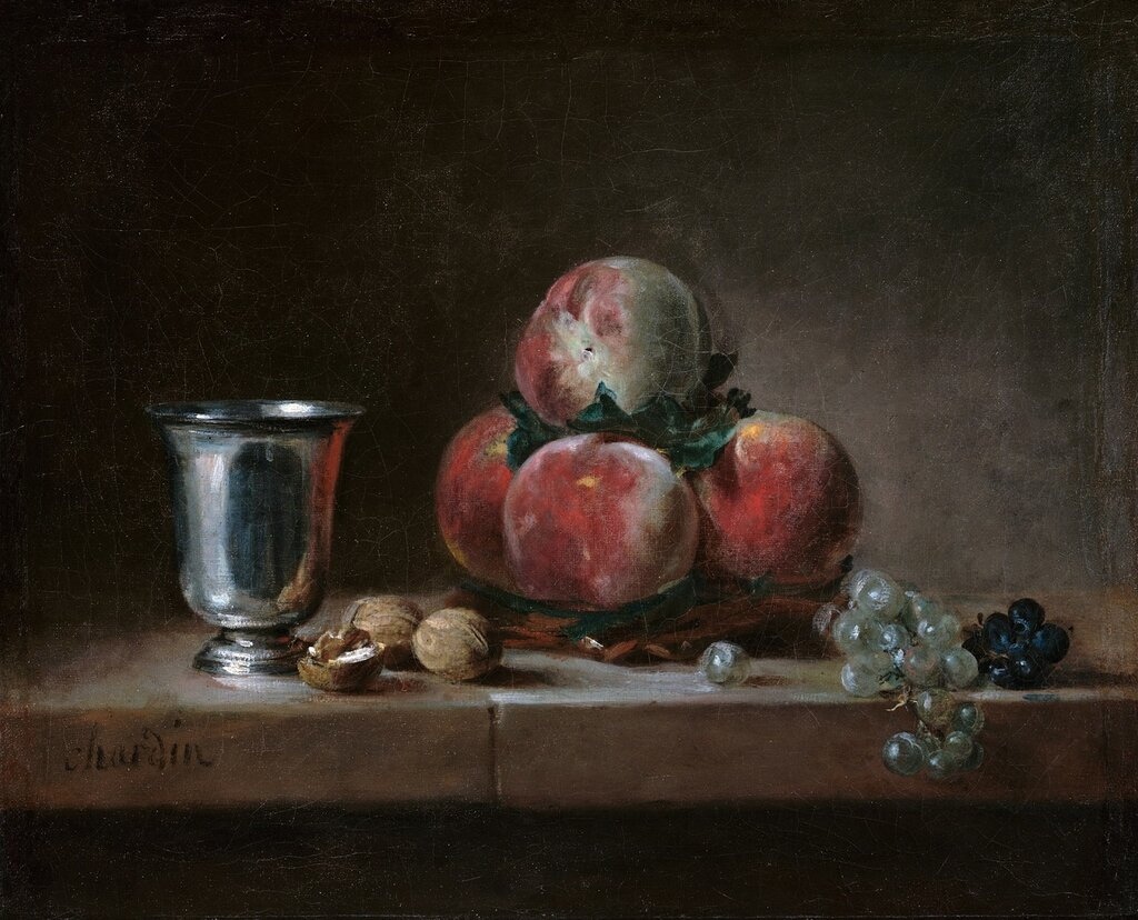 Жан Батист Симеон Шарден «Натюрморт с персиками, серебряным кубком, виноградом и грецкими орехами», 1760 Музей Гетти, Лос-Анджелес Рококо