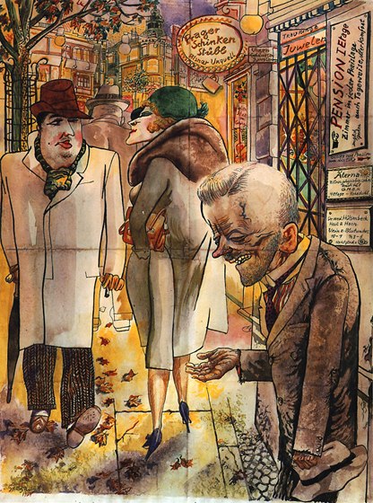 Георг «Уличная сценка в Берлине» Элегантная дама в мехах и на высоких каблуках презрительно морщит нос в ответ на подмигивание щеголеватого господина, столкнувшегося с ней на фешенебельной улице. Парочка, занятая своим флиртом, не замечает бедно одетого старика с протянутой рукой. Данная акварель является едкой сатирой на ужасные социальные условия послевоенной Германии. Художник создал множество карикатур,… Подробнее »