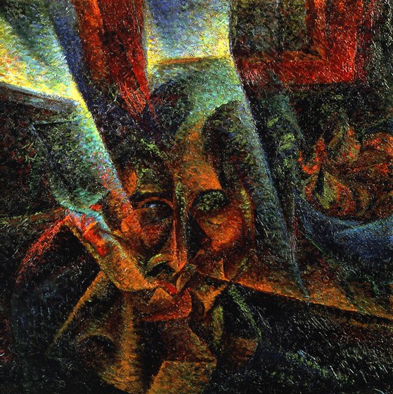 Умберто «Голова + Свет + Окружение»,1912 Формы — фрагментарные, изорванные — мечется, увлекаемые каким-то вихрем. Из красных, синих граней проступает человеческая голова: это мир, увиденный во вращающемся калейдоскопе. Картина воплощает идею движения сквозь пространство и время — идею, которой Боччони был всецело увлечен. Он был одним из основателей итальянского футуристического искусства и в 1910 году… Подробнее »