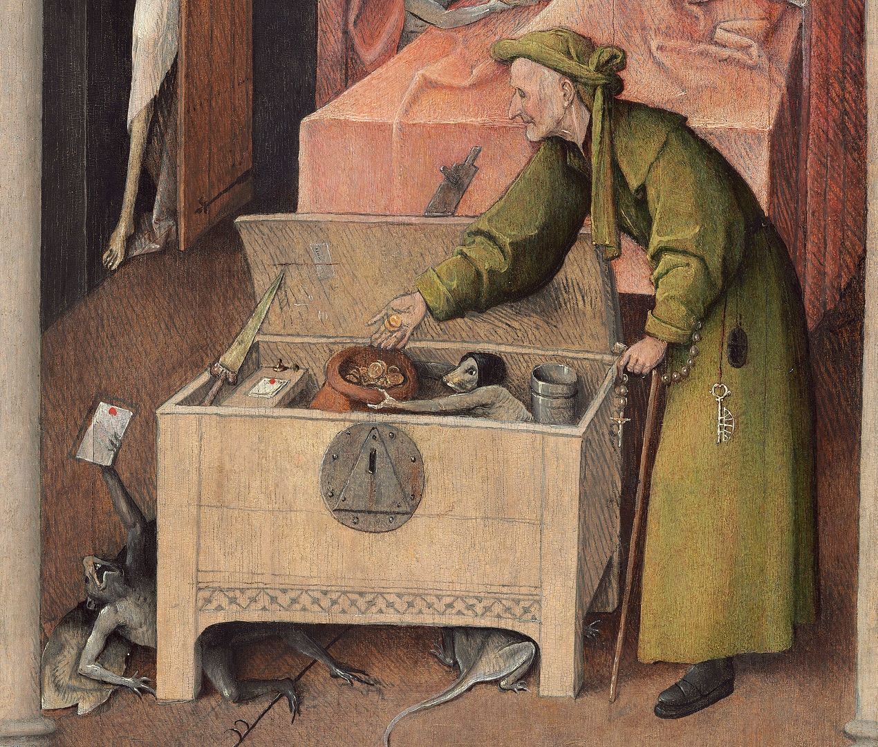 Иероним Босх «Смерть скупца», 1500 Национальная галерея искусства, Вашингтон Возрождение На картине изображена узкая и высокая спальня, в открытую дверь которой уже заглядывает Смерть. Ангел-хранитель, поддерживая умирающего, пытается обратить его взор к распятию в оконной нише, однако человек всецело занят помыслами о тех материальных богатствах, с которыми ему сейчас суждено будет расстаться. Одной рукой он… Подробнее »